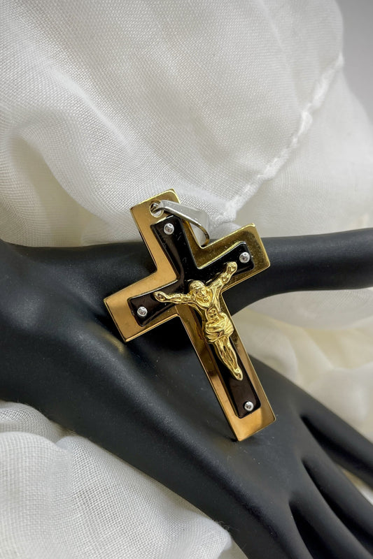 Edelstahl Kettenanhänger – Goldfarbenes Kreuz mit schwarzem Akzent und Jesusfigur